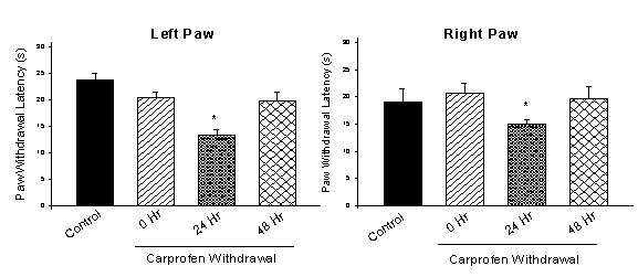 Figure 1. Paw withdrawal latency (mean ± SEM; n=8) in the Plantar test at IR25 after 0, 24 and 48 h into cessation of carprofen treatment. * P < 0.05 compared to control. Hargreaves, K. et al. (1988). Pain 32, 77-88 |